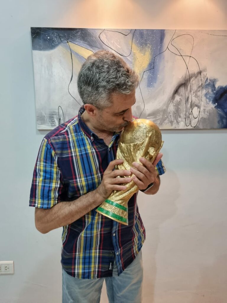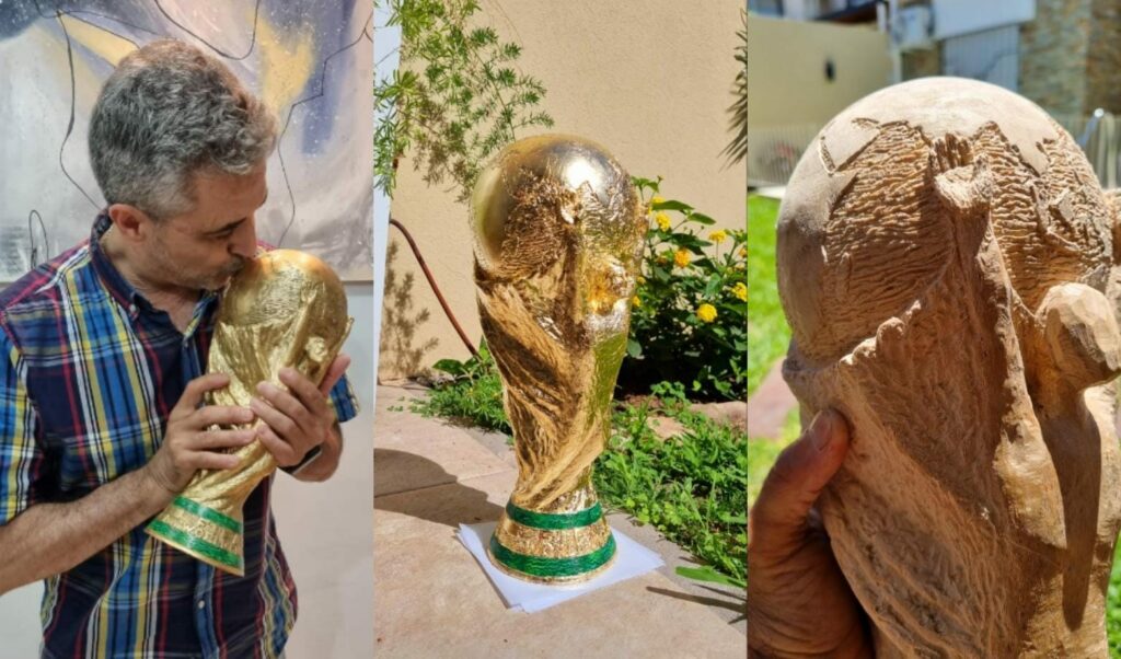 En sus redes sociales escribió como realizó el trofeo que consiguió la selección Argentina, en el Mundial de Qatar 2022 y también le dejó un mensaje a Messi: “Mi pasión y hobby son las esculturas y el tallado de madera con motosierra. He donado obras al Complejo museológico de San Lorenzo. En la página de Facebook: “Mónica y Sergio – Arte de a Dos” puedes ver lo que hacemos con mi señora”.