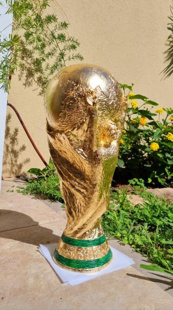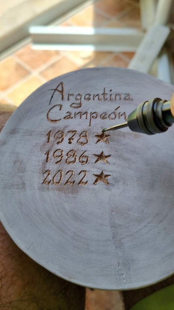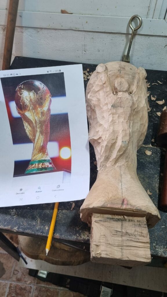 En sus redes sociales escribió como realizó el trofeo que consiguió la selección Argentina, en el Mundial de Qatar 2022 y también le dejó un mensaje a Messi: “Mi pasión y hobby son las esculturas y el tallado de madera con motosierra. He donado obras al Complejo museológico de San Lorenzo. En la página de Facebook: “Mónica y Sergio – Arte de a Dos” puedes ver lo que hacemos con mi señora”.