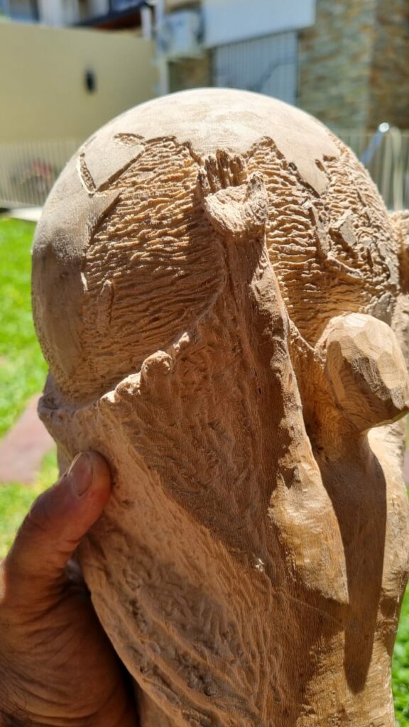 Se trata de Sergio Fois, una persona que trabajó siempre en la industria petroquímica, pero de grande le picó bichito del hobby de la artesanía y empezó a tallar madera. En los últimos días esta persona oriunda de la localidad de San Lorenzo dio a conocer en sus redes sociales que empezó a fabricar la Copa Mundial de la FIFA con un trozo de tronco del pino histórico de San Lorenzo que hace unos años le obsequió el director del Complejo museológico de la ciudad.