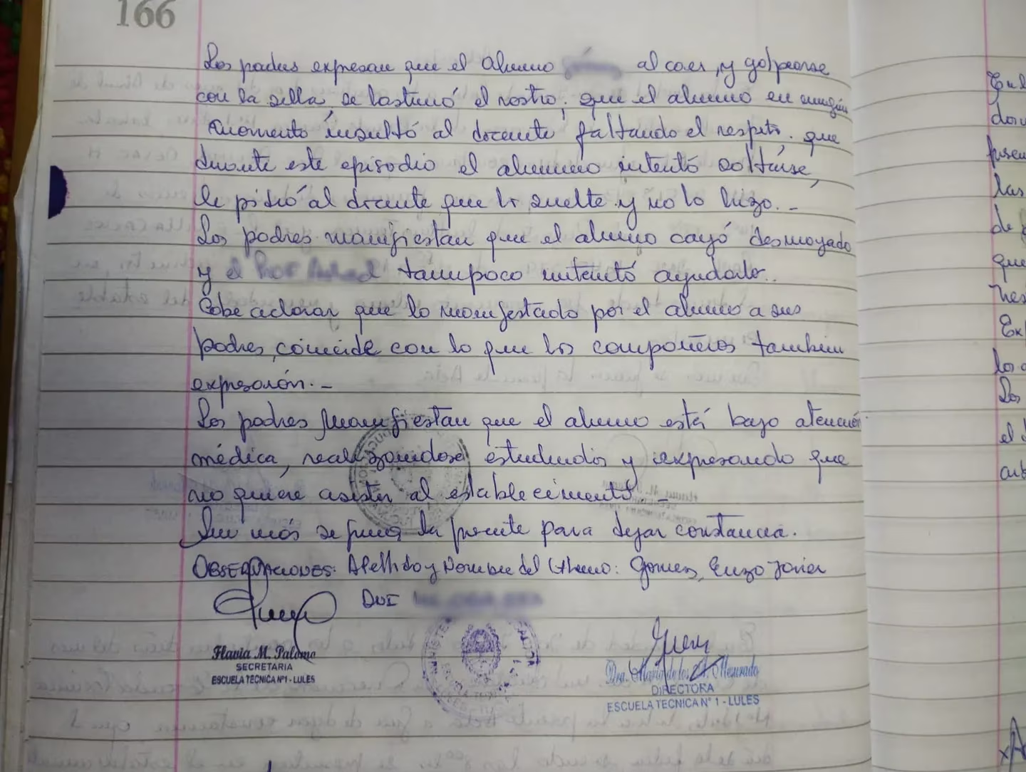 La familia del alumno presentó una denuncia penal contra el docente al día siguiente, y los compañeros del adolescente agredido decidieron no asistir a clases como forma de protesta. Un grupo de padres se hizo presente en la puerta de la institución para pedir explicaciones por el hecho y solicitar que el docente fuera desplazado de su puesto.