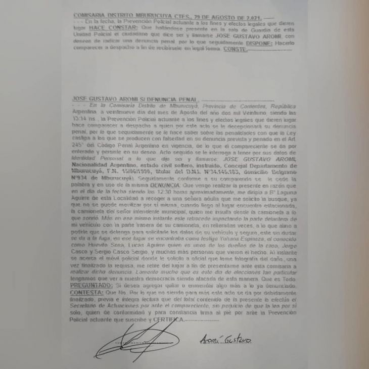 Mburucuyá queda a aproximadamente 150 kilómetros de la capital de la provincia, y al igual que en otras localidades correntinas, este fin de semana se desarrollaron las elecciones para definir a los próximos legisladores. En ese contexto, Gustavo Aromí, candidato opositor del Intendente, denunció que Pablo Guastavino, mandatario en la actualidad y que busca la reelección, lo embistió con su vehículo personal.