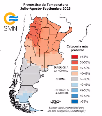 En tanto, para el norte del país, el NOA, la región de Cuyo, la provincia de Buenos Aires, La Pampa y la Patagonia, el pronóstico indica una situación “normal o superior a la normal”. Es decir, si bien puede haber cierta variabilidad, predominan las probabilidades de registros térmicos por encima de los valores históricos.