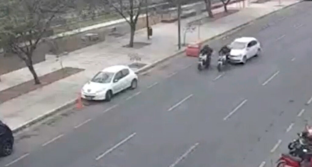 En las imágenes se observa cuando un auto Volkswagen, de color blanco, conduce por el carril que se encontraba paralelo a los uniformados. De un momento a otro, el vehículo se posó por detrás y los atropelló a gran velocidad.