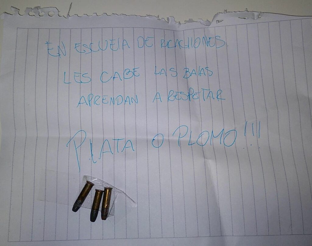 Colombo detalló que se trató de “una amenaza con connotaciones fuertes”. “Balas, una amenaza no ingenua ni de niños. Es la primera vez que nos pasa. Veníamos escuchando de tantas escuelas. Sabíamos que nos podría tocar”, añadió.