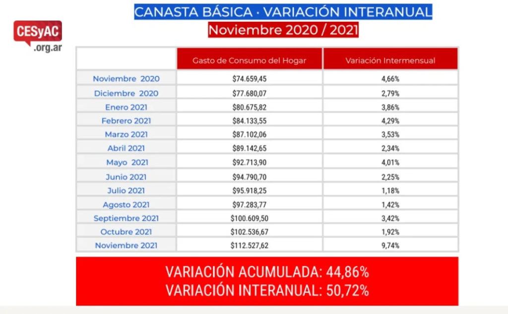 Una familia tipo -compuesta por dos adultos y dos niños- necesitó 112.527 pesos en noviembre para no estar bajo de la línea de la pobreza. La cifra fue anunciada por el Centro de Educación, Servicios y Asesoramiento al consumidor, que realizó un estudio con los costos de la canasta básica de noviembre con respecto al mes de octubre.