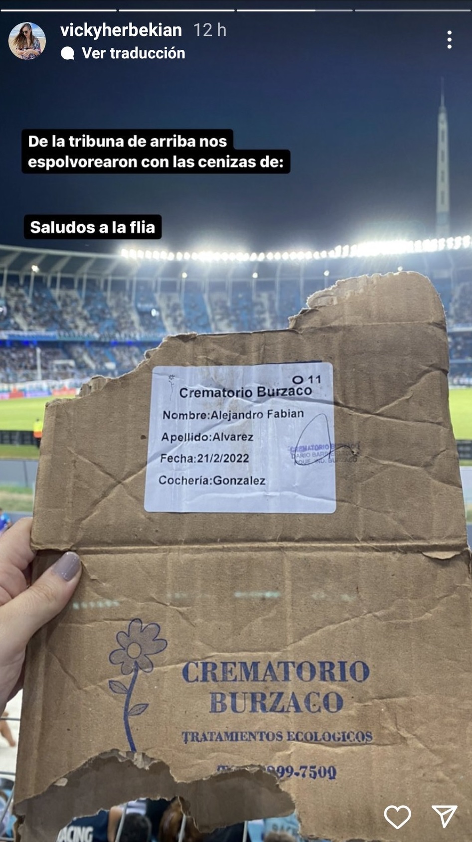 En la imagen se ve el cartón y los datos de la persona fallecida, la cual fue cremada, que se entiende fanática de Racing y ahora una parte suya quedó en el Cilindro.