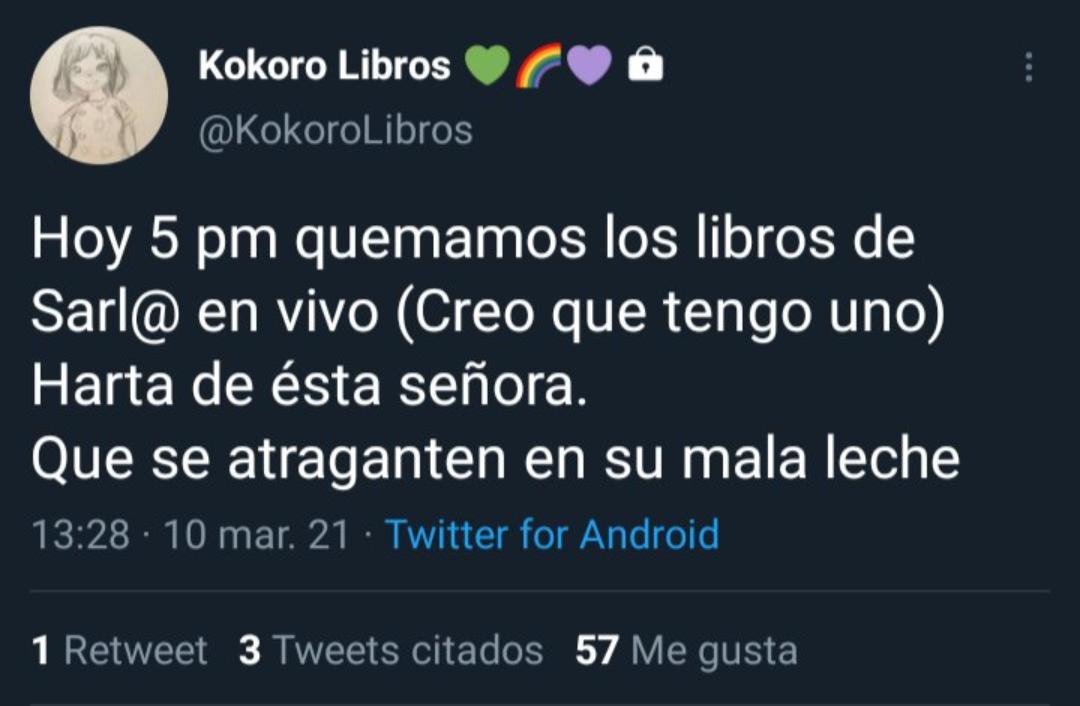 “Hoy 5pm quemamos los libros de Sarl@ en vivo (creo que tengo uno)”, escribió en su cuenta de Twitter Kokoro Libros. Y añadió: “Harta de esta señora. Que se atraganten en su mala leche”. Momentos después, una catarata de usuarios de la red social contestaron el mensaje con expresiones en rechazo. Entre ellos, el cineasta Juan José Campanella.
