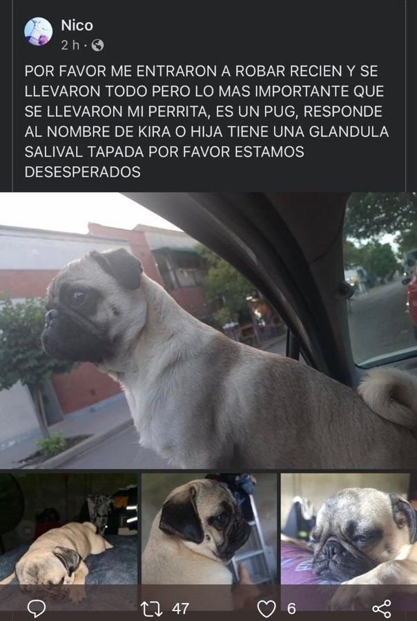 Una joven pareja de Puerto General San Martín lleva adelante un pedido desesperado. Este lunes, delincuentes ingresaron a su vivienda ubicada en el barrio Tierra de Sueños y se la desvalijaron. Inclusive, los ladrones se llevaron hasta a su perrita Kira, una Pug.
