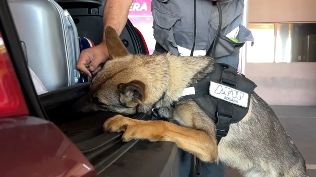 El agente aduanero que realizaba el procedimiento estaba acompañado por China, una ovejera alemán que descubrió el total de 121.600 dólares que estaban ocultos en un bolso debajo de la rueda de auxilio de la familia argentina.
