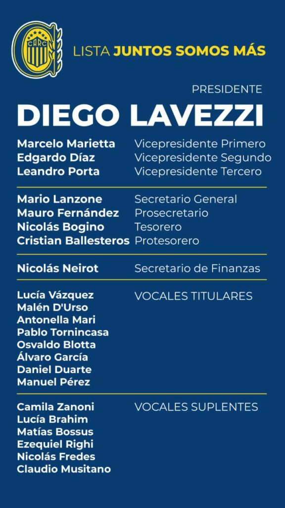 Durante la tarde, se conoció la lista completa, ya que es la que más hermetismo mantenía a su alrededor. Ramiro Colabianchi, que se encaminaba para ser el vicepresidente primero, finalmente será el tercero ya que Carolina Cristinziano será la vicepresidenta 1.