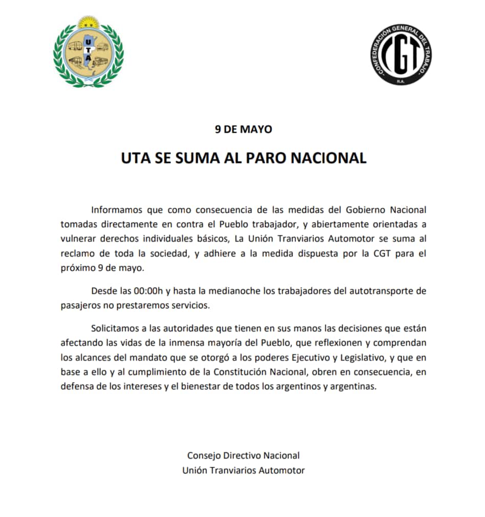 En un comunicado emitido por UTA, aseguraron que el gremio formará parte de las medidas de protestas contra el gobierno nacional anunciadas para el 9 de mayo. “Informamos que como consecuencia de las medidas tomadas directamente en contra del pueblo trabajador, y abiertamente orientadas a vulnerar derechos individuales básicos, UTA se suma al reclamo de toda la sociedad y adhiere a la medida dispuesta por la CGT”, expresaron.
