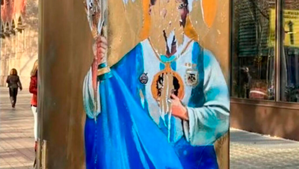 Un mural de Lionel Messi posando con la Copa obtenida en el reciente Mundial de Qatar 2022 y vestido como un santo, obra del artista urbano Tvboy en la avenida Diagonal de Barcelona, España, apareció este viernes vandalizado.