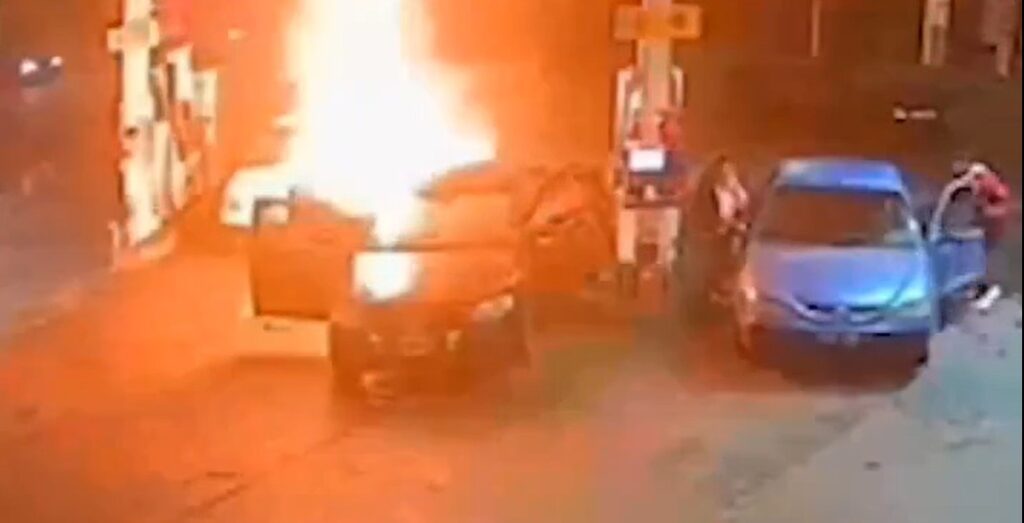 Una cámara de seguridad registró el momento en el que el vehículo comenzó a incendiarse, lo que generó pánico entre los otros usuarios que se encontraban cargando nafta, como así también en los playeros.