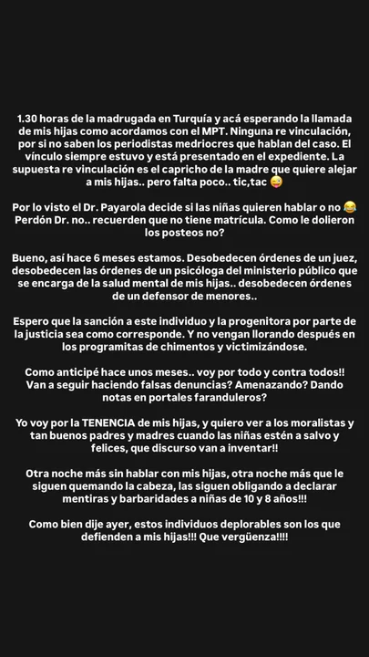“1.30 horas de la madrugada en Turquía y acá esperando la llamada de mis hijas como acordamos con el MPT. Ninguna revinculación, por si no saben los periodistas mediocres que hablan del caso. El vínculo siempre estuvo y está presentado en el expediente. La supuesta revinculación es el capricho de la madre que quiere alejar a mis hijas… pero falta poco… tic, tac”, escribió en sus Instagram Stories.