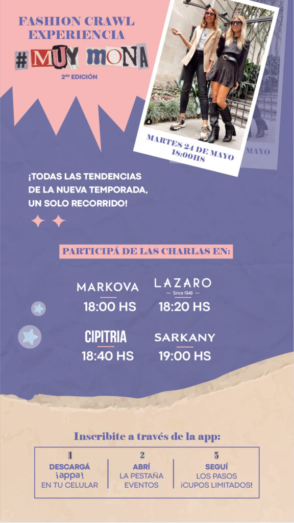 En esta oportunidad, tal como se hizo exitosamente el pasado jueves 12 de mayo, las clientas junto las Muy Mona recorrerán por las siguientes marcas comenzando a las 18Hs. en Markova, para luego continuar por Lázaro, Cipitria, y el cierre estará a cargo de Sarkany con importantes descuentos, drinks & music para agasajar a las clientas.
