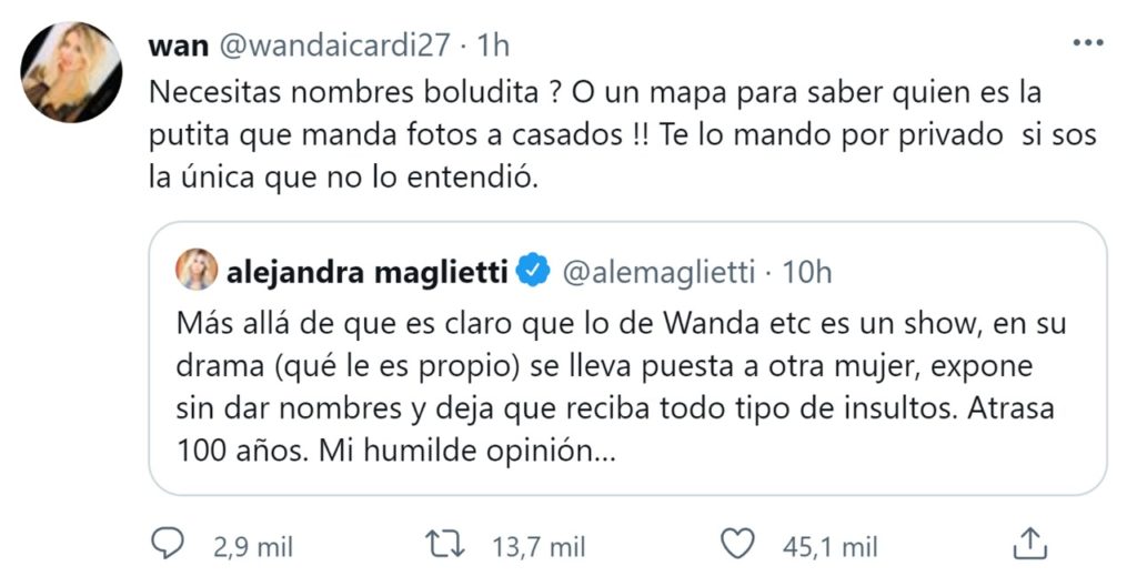 Después de horas misteriosas y publicaciones confusas, la representante de futbolistas utilizó sus redes sociales para defenestrar a quien le enviaba mensajes a su marido. “Necesitas nombres boludita? O un mapa para saber quien es la putita que manda fotos a casados !! Te lo mando por privado si sos la única que no entendió (SIC)“, escribió en respuesta a Alejandra Maglietti, quien defendió a la actriz. No obstante, minutos después borró el mensaje.