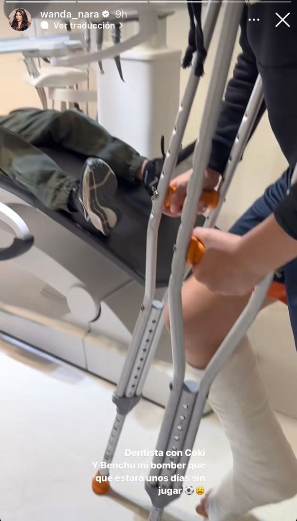 La influencer mostró cómo llevaba a Constantino al odontólogo para revisar su sonrisa producto de la separación de dos piezas dentales. Pero la atención se la llevó Benedicto, que tenía una pierna enyesada. Wanda junto a la historia que subió escribió: “Dentista con Coki y Benchu, mi bomber, que estará unos días sin jugar”.