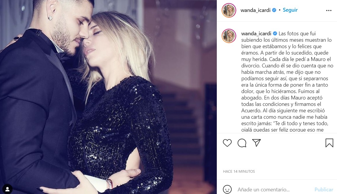 “Y ahí me dí cuenta de algo: que teniendo todo no tengo nada si no estoy con el. Estoy segura que este mal momento que atravesamos nos fortalecerá como pareja y como familia. Lo importante es que los dos tuvimos la libertad de ponerle fin a nuestra historia de 8 años, pero con el alma cansada de llorar, libremente nos volvimos a elegir. Te Amo @mauroicardi”, finalizó el posteo.