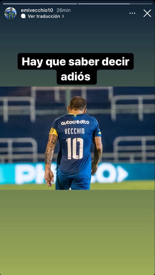 Luego de que el arquero Agustín Rossi le atajara un penal en la derrota de Rosario Central ante Boca Juniors por 2 a 1 , el mediocampista canalla, Emiliano Vecchio publicó una historia en su cuenta de Instagram donde se lo ve de espaldas en pleno partido con la camiseta auriazul y la frase: “Hay que saber decir adiós”.