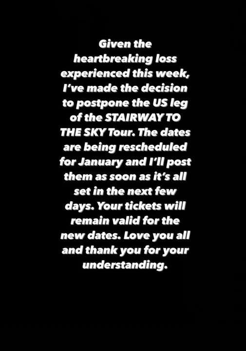 La gira de Malik, que estaba programada para comenzar la próxima semana en San Francisco, incluiría conciertos en ciudades como Las Vegas, Los Ángeles, Washington D.C. y Nueva York, finalizando el 3 de noviembre. A través de sus redes sociales, el cantante comunicó a sus fans que debido a esta triste pérdida, decidió posponer el “Stairway to the Sky Tour” en Estados Unidos, y aseguró que las fechas se reprogramarán para enero de 2025. Las entradas adquiridas seguirán siendo válidas para las nuevas presentaciones.